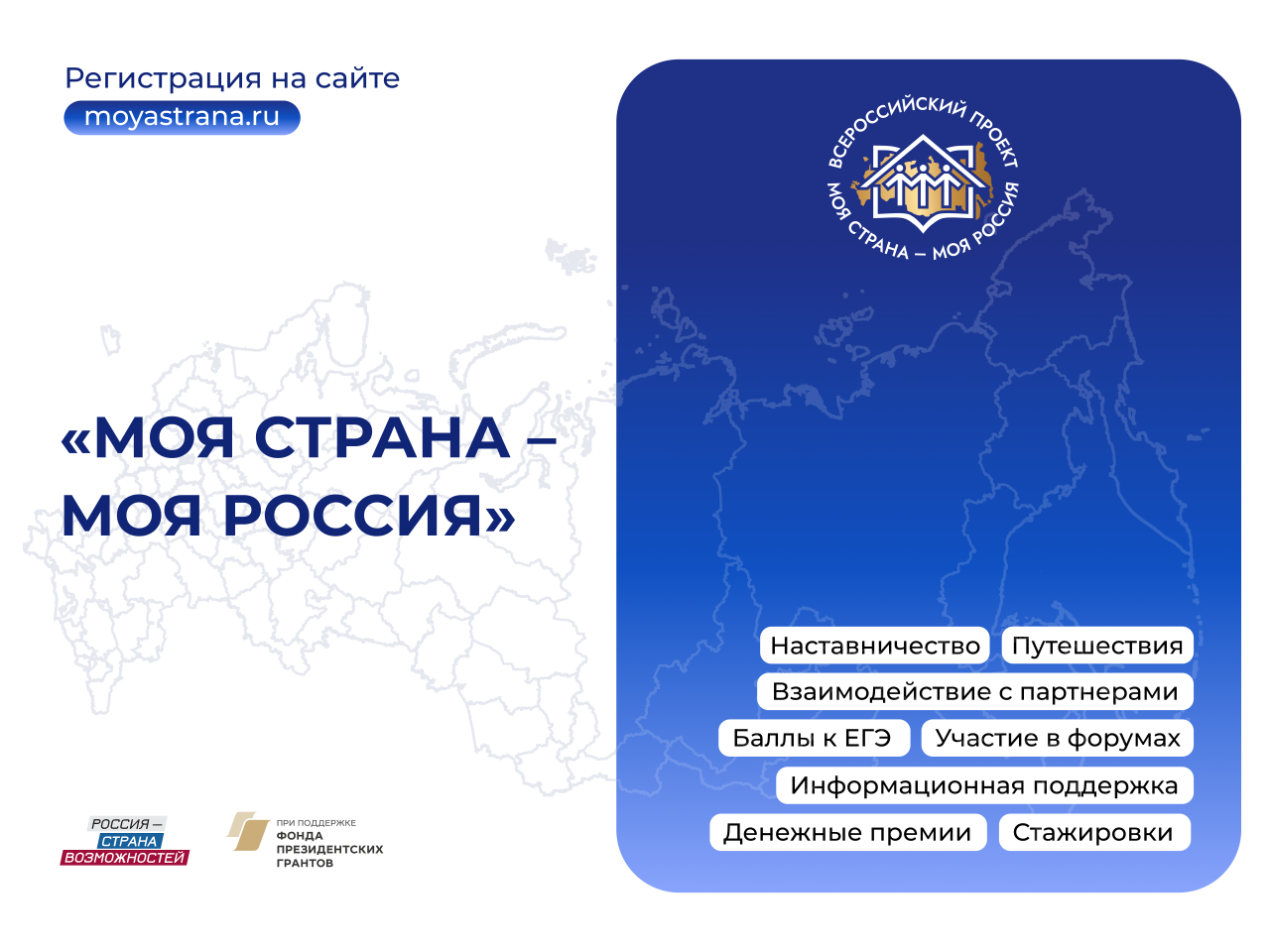 Конкурс "Моя страна – моя Россия" проводится в рамках реализации федерального проекта "Россия – страна возможностей" национального проекта "Молодёжь и дети" при поддержке Фонда президентских грантов.
